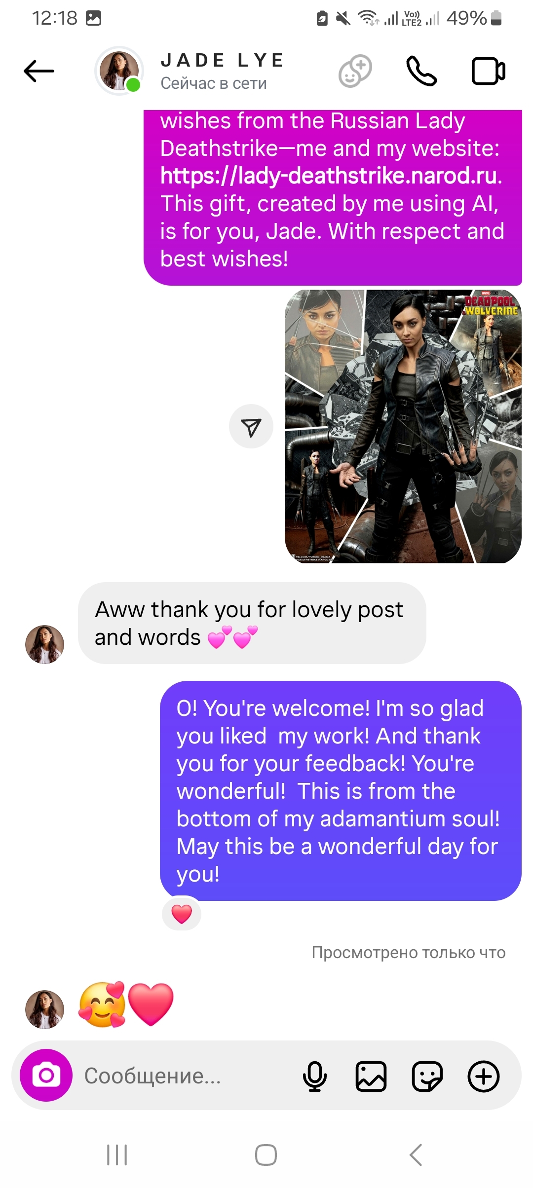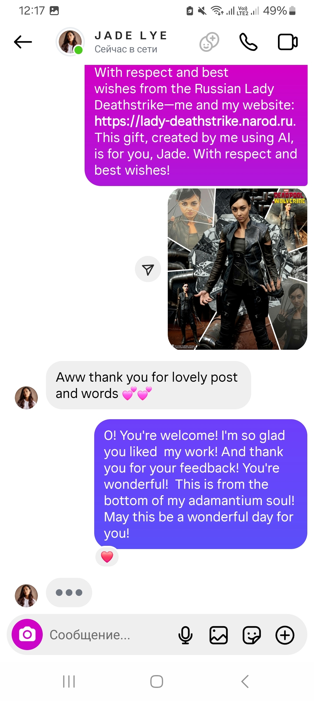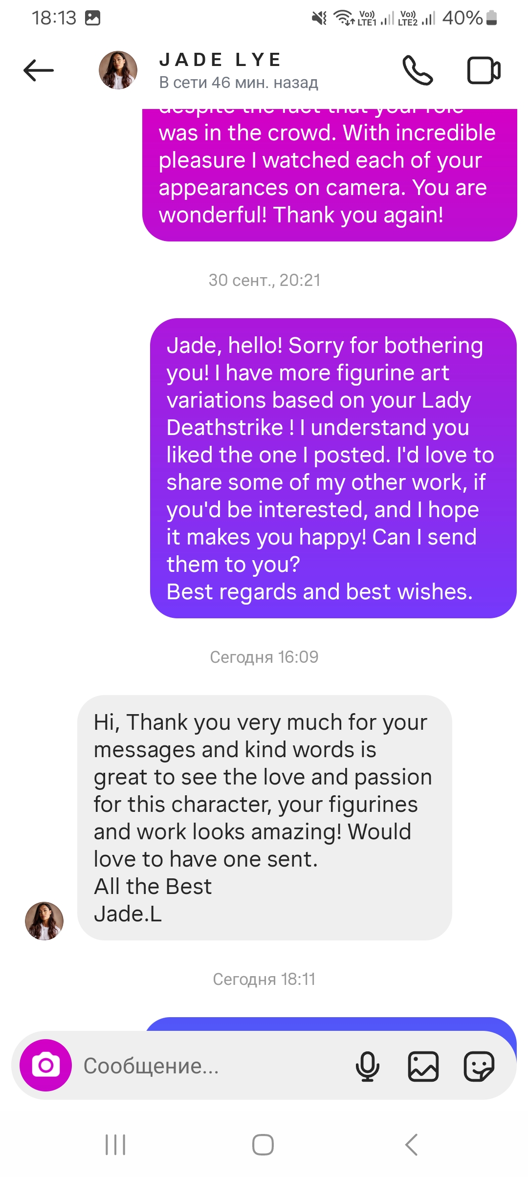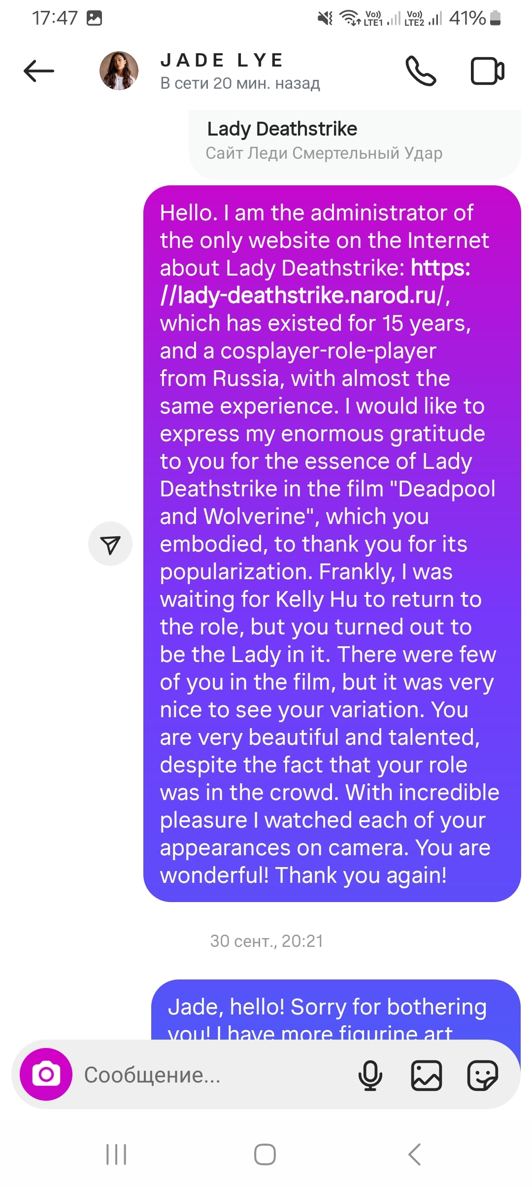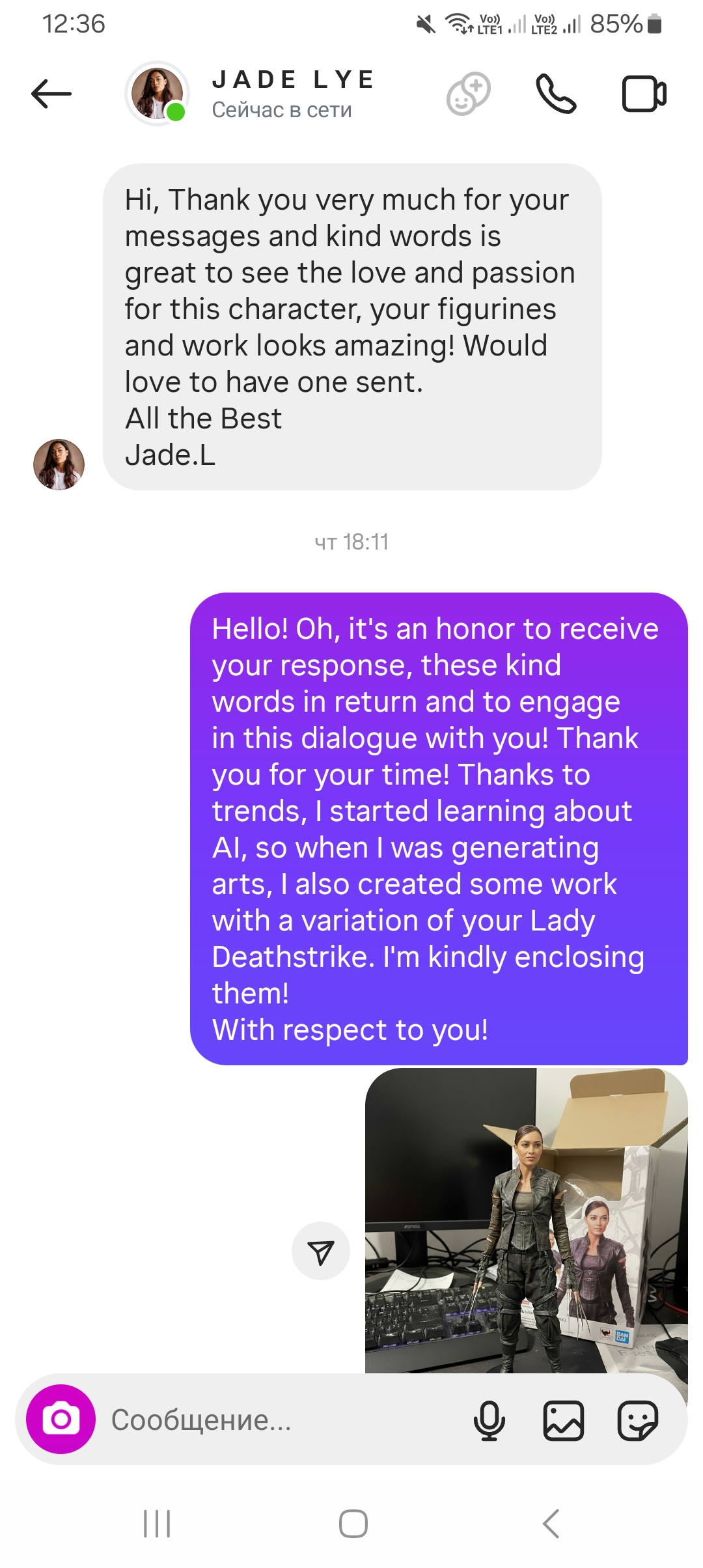 В этот день состоялся еще один когтистый коннект через личные сообщения Инстаграм, как то было у меня с Брайаном Коксом, годами ранее. В оный день в личку мне ныне написала сама…Джейд Лай, что сыграла Леди Смертельный Удар в «Дэдпул и Росомаха». 17 августа 2024 года я написала Джейд в личные сообщения слова благодарности за популяризацию сущности Леди Смертельный Удар в фильме. Да, это была не Келли Ху в проекте, ее никто так и не вернул на большой экран, и как бы это все мне не особо нравилось, но приятные слова этой «когтистой сестре» стоило сказать. Послание осталось, казалось, без ответа. Однако, не столь давно я генерировала арты по фото, благодаря засилью трендов с ИИ, ну и один из них Джейд приглянулся. Об этом коннекте можно прочитать выше. Я написала ей очередное послание о том, что у меня есть еще вариации артов с ней, которые я бы хотела ей показать, ну и 30 сентября это сообщение отправила. Ныне же на него был получен ответ, как и на то мое старое сообщение. Другие варианты артов с ней, сгенерированные мною в ИИ, пришлись ей тоже по душе. Джейд в этот же вечер оценила эти арты фигурок с ней, отписав мне еще пару строк. 18 октября мы еще обменялись парой сообщений. Она сообщила мне свой День рождения, а также сказала о том, что была бы рада заиметь такую фигурку (решив, что они есть у меня не только в виде изображения). На что я ответила ей, что если она приедет когда-нибудь к нам в Россию, и наша встреча состоится, у меня есть повод найти мастера, который изготовит подобное, дабы вручить ей. Джейд это понравилось.