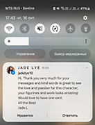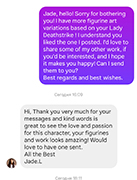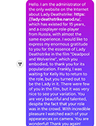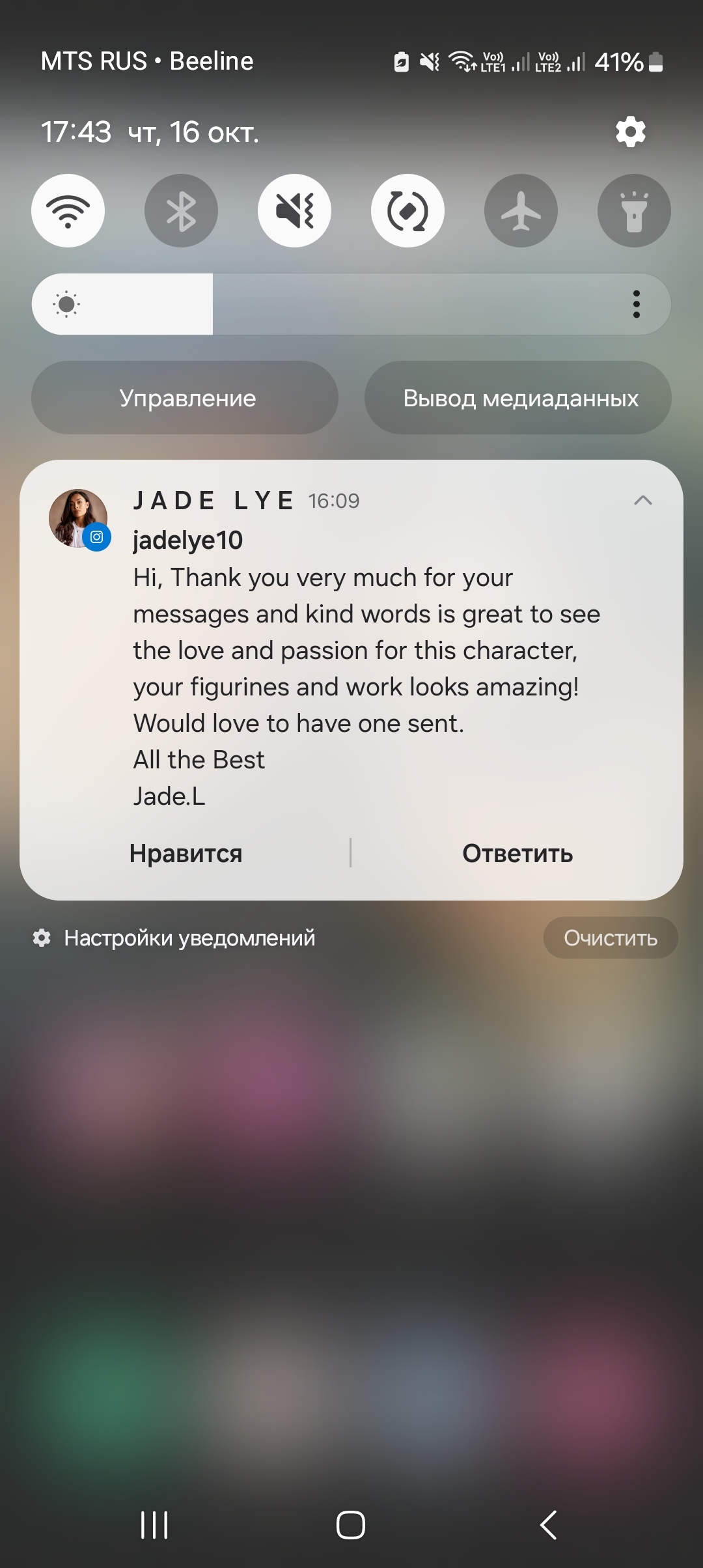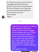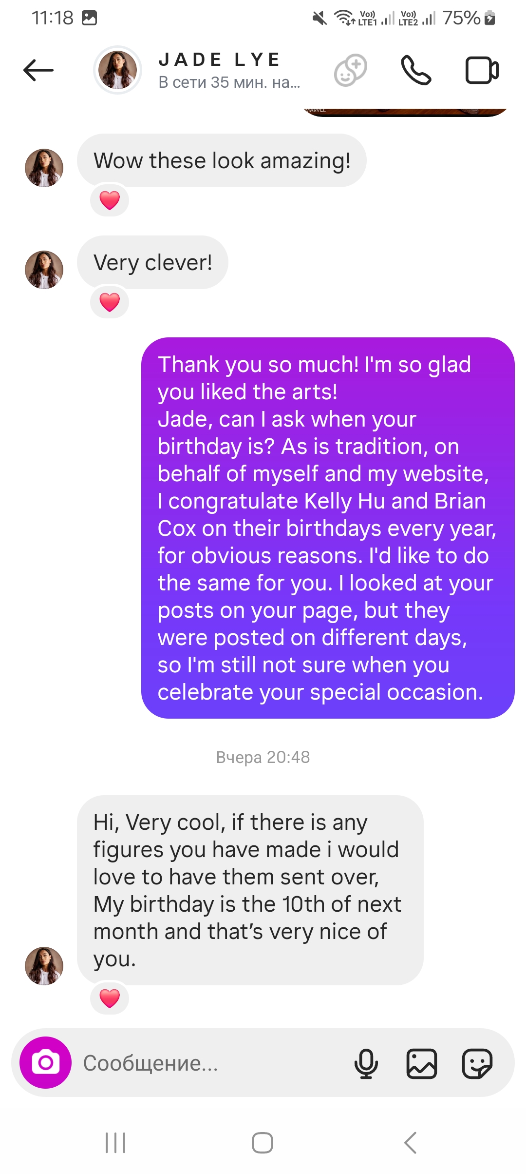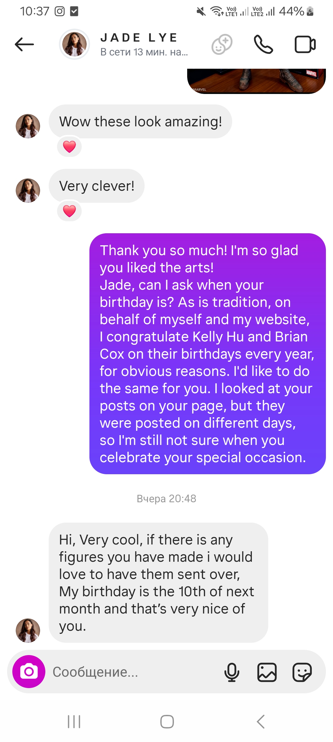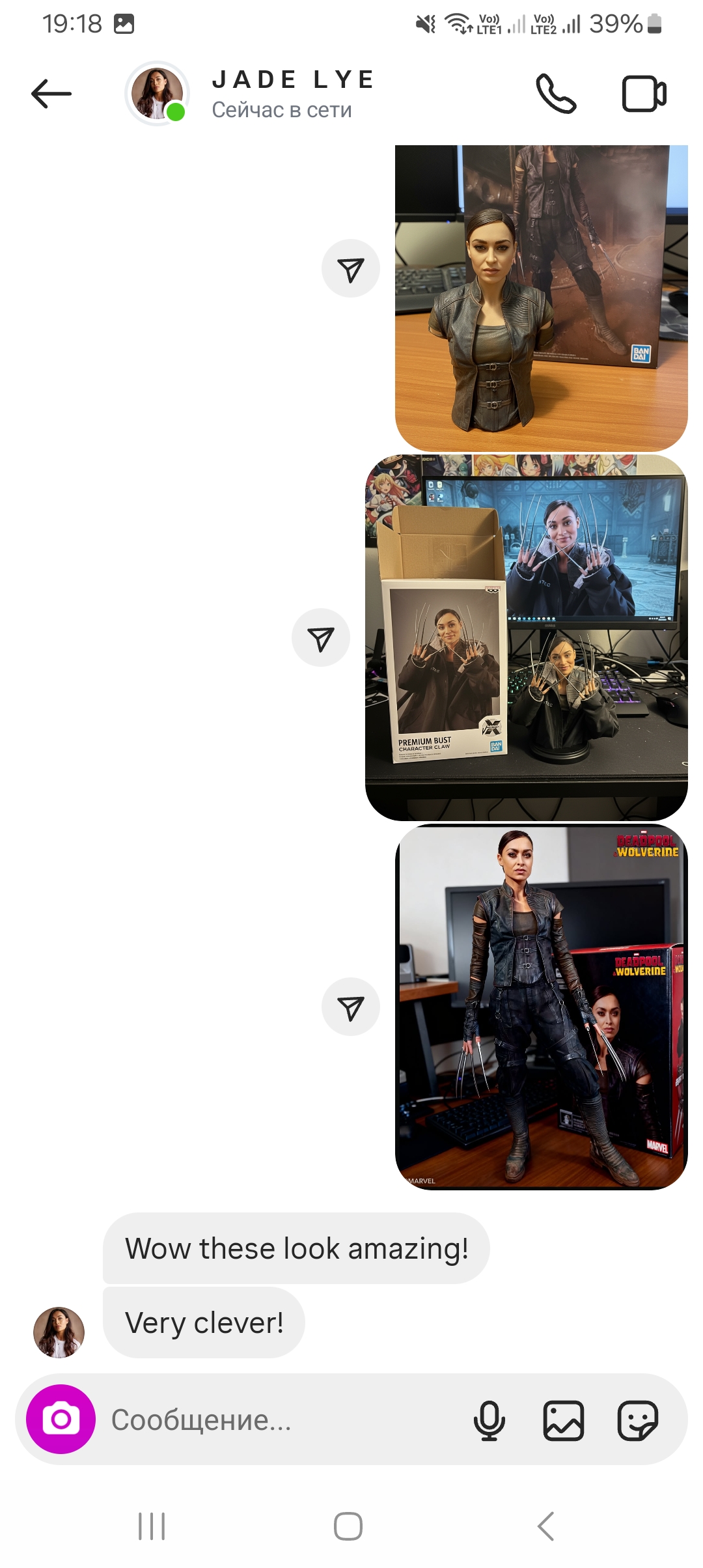 В этот день состоялся еще один когтистый коннект через личные сообщения Инстаграм, как то было у меня с Брайаном Коксом, годами ранее. В оный день в личку мне ныне написала сама…Джейд Лай, что сыграла Леди Смертельный Удар в «Дэдпул и Росомаха». 17 августа 2024 года я написала Джейд в личные сообщения слова благодарности за популяризацию сущности Леди Смертельный Удар в фильме. Да, это была не Келли Ху в проекте, ее никто так и не вернул на большой экран, и как бы это все мне не особо нравилось, но приятные слова этой «когтистой сестре» стоило сказать. Послание осталось, казалось, без ответа. Однако, не столь давно я генерировала арты по фото, благодаря засилью трендов с ИИ, ну и один из них Джейд приглянулся. Об этом коннекте можно прочитать выше. Я написала ей очередное послание о том, что у меня есть еще вариации артов с ней, которые я бы хотела ей показать, ну и 30 сентября это сообщение отправила. Ныне же на него был получен ответ, как и на то мое старое сообщение. Другие варианты артов с ней, сгенерированные мною в ИИ, пришлись ей тоже по душе. Джейд в этот же вечер оценила эти арты фигурок с ней, отписав мне еще пару строк. 18 октября мы еще обменялись парой сообщений. Она сообщила мне свой День рождения, а также сказала о том, что была бы рада заиметь такую фигурку (решив, что они есть у меня не только в виде изображения). На что я ответила ей, что если она приедет когда-нибудь к нам в Россию, и наша встреча состоится, у меня есть повод найти мастера, который изготовит подобное, дабы вручить ей. Джейд это понравилось.