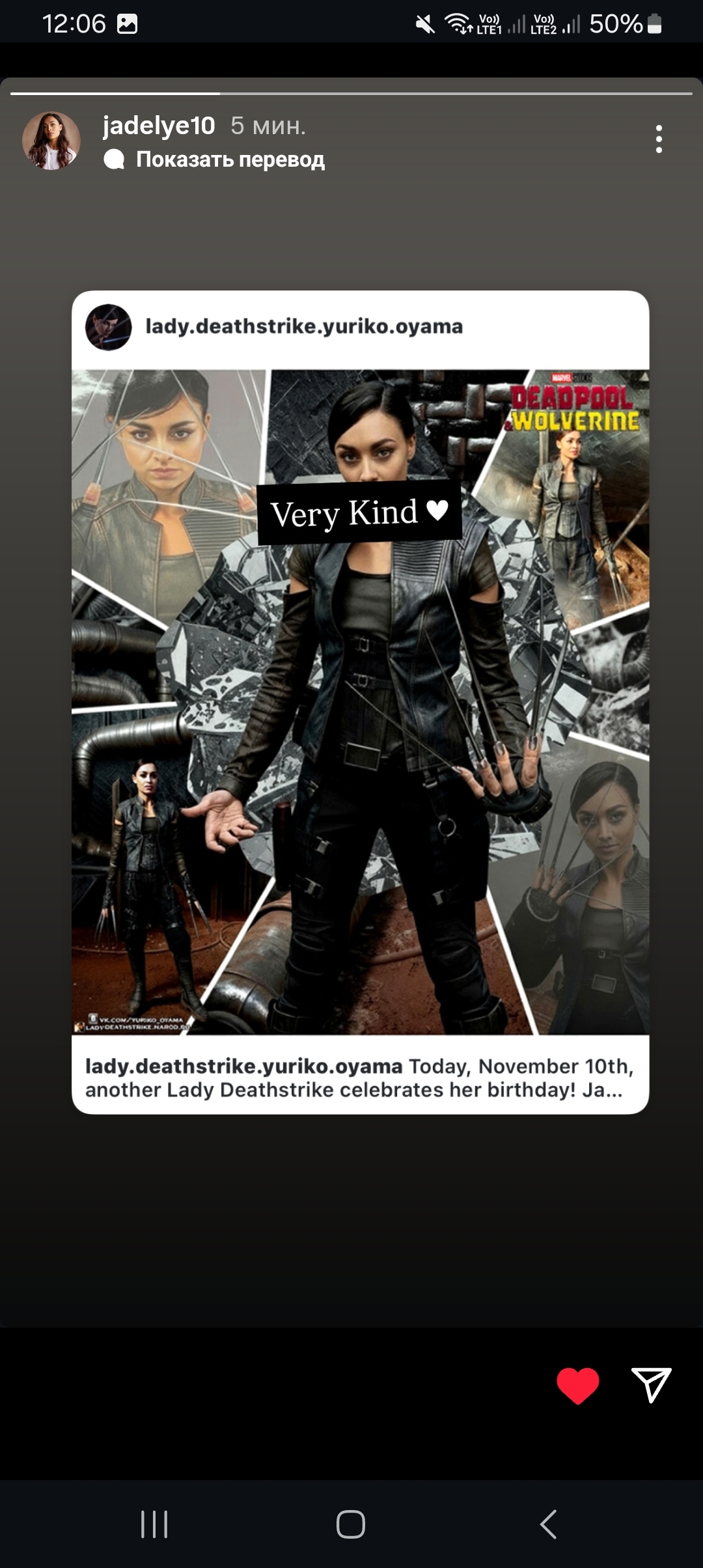 10 ноября свой День рождения отмечала Джейд Лай, сыгравшая Леди Смертельный Удар в "Дэдпул и Росомаха". Узнав ранее в личной переписке дату ее рождения, в этот год я решила поздравить с этим торжеством и ее (как Келли Ху и Брайана Кокса, по сложившейся традиции обители). Для Джейд я припасла презент - коллаж, сделанный мною с помощью ИИ и Photoshop и поздравление. Отклик этот пост нашел сразу же после публикации: его Джейд забрала к себе на страничку в историю, там он красовался 24 часа, а в личке мне она отписала приятные строки и смайлики. Чертовски приятно иметь этот мгновенный фидбэк и видеть, как «когтистая сестра» онлайн и печатает сообщение в чате. Непередаваемые эмоции.