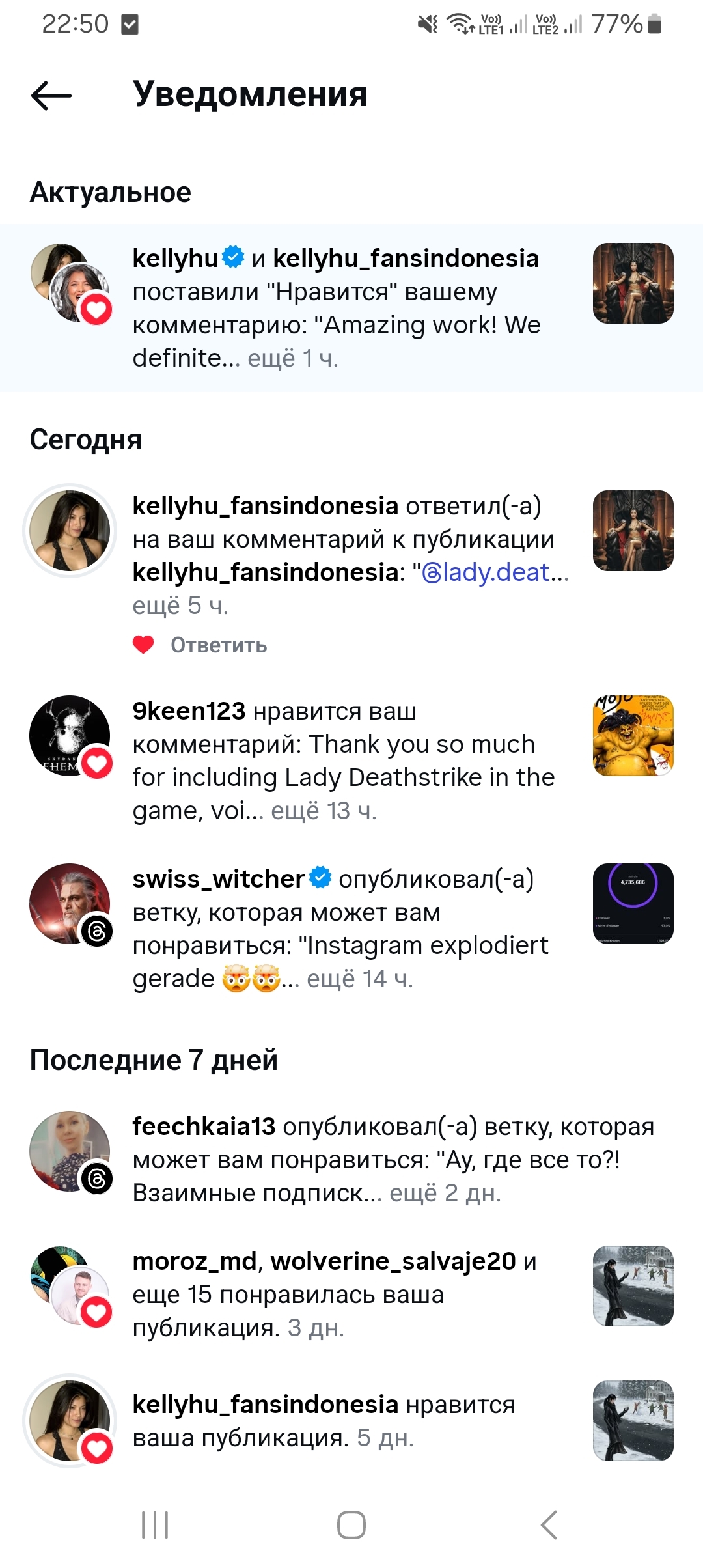 В своих подписчиках в оное утро я обнаружила Джейд Лай - актрису, воплотившую образ Леди Смертельный Удар в "Дэдпул и Росомаха". Однако, увы, спустя время, актриса отписалась. Вероятно, спутала Вашу покорную слугу с Келли Ху.