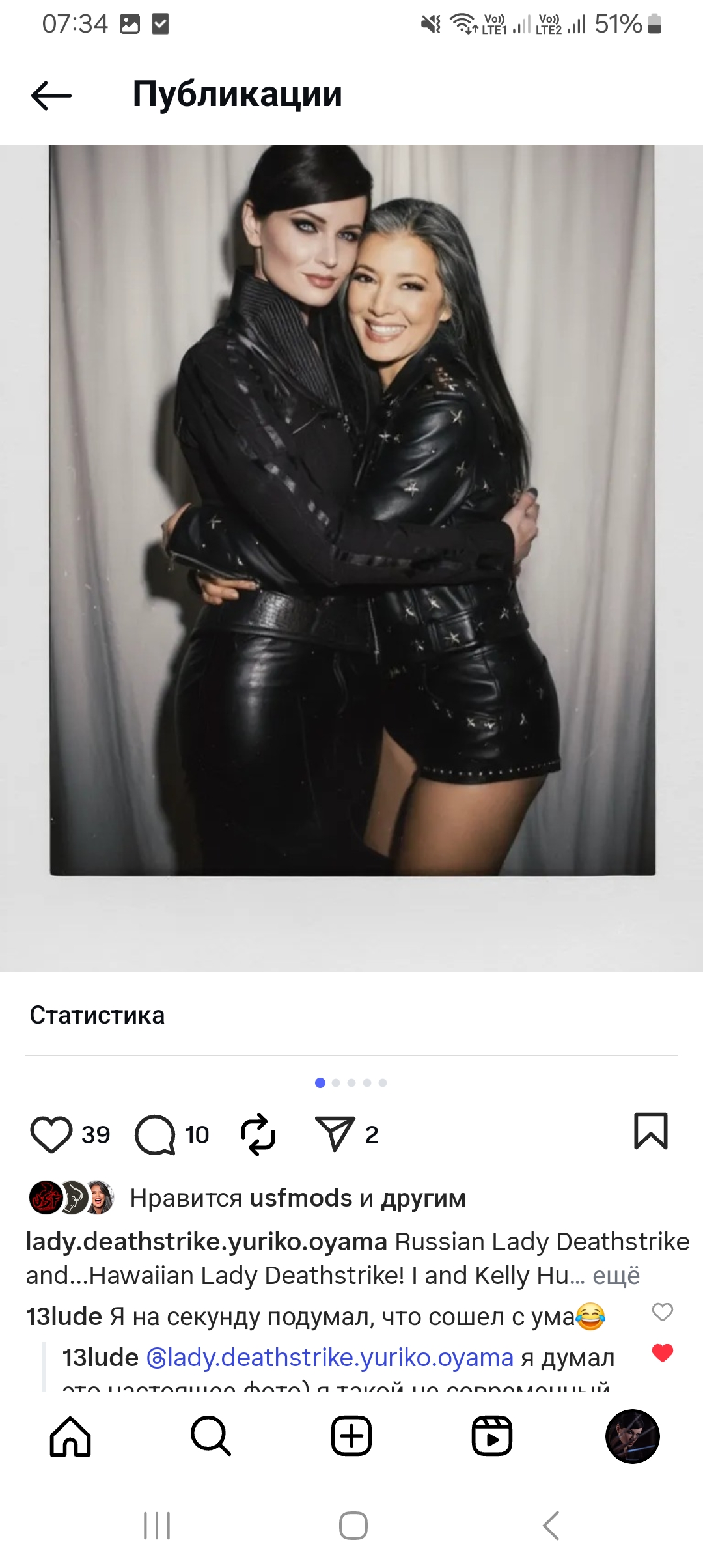 Сгенеренные мною арты с фигурками, с помощью ИИ (которые можно найти в разделе «Творчество») были залиты в оный день в Инстаграме, и один из них, сделанный с вариацией Леди Смертельный Удар от Джейд Лай, которая воплотила когтистый образ в «Дэдпул и Росомаха», привлек саму актрису. Она не только пришла на страничку к Вашей покорной слуге, лайкнув пост с фигурками, и, оставив коммент под данным постом, но и отметила сердечком мой ответ на него, а еще убрала созданное мною изображение себе…в историю! Собственно, полный коннект с когтистой вариацией из параллельной Вселенной состоялся. Помимо этого, отметить мой пост пришли и друзья Джейд, среди которых оказался и еще один мутант из «Дэдпул и Росомаха» – шипастая Куилл (Нилли Четин).