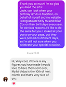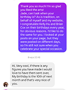 Открытка и поздравление для Келли Ху, отправленные в утро, 13 февраля, тут же нашли отклик от Келли в ее День рождения.